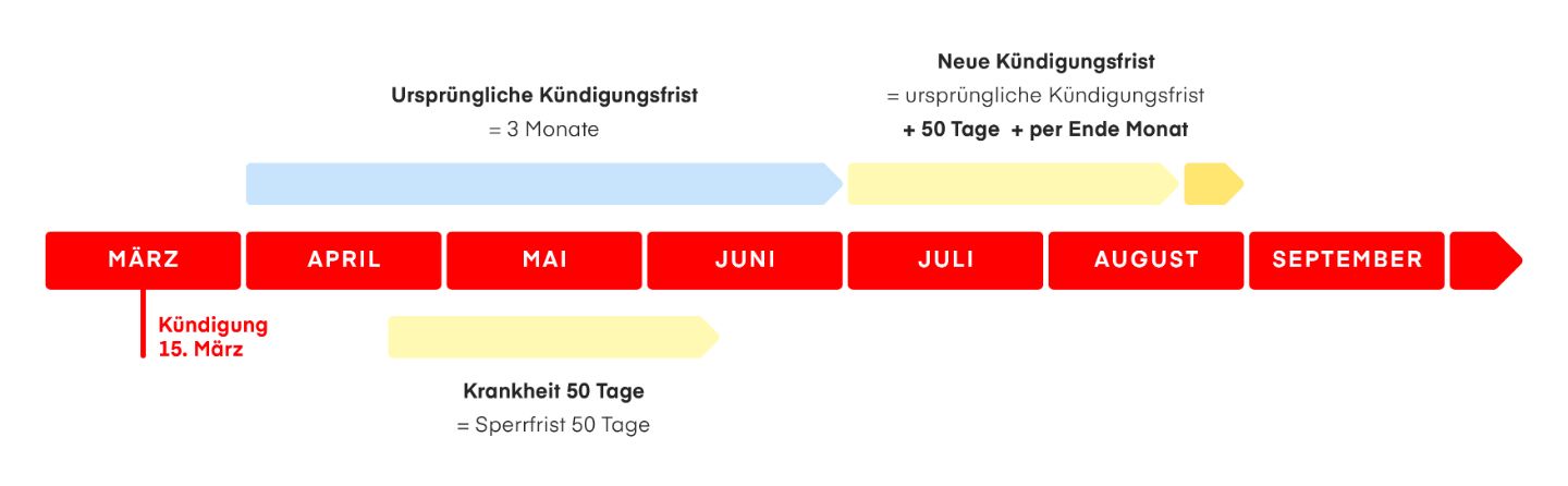 Mitte März kündigt ein Unternehmen seiner langjährigen Mitarbeiterin Petra Muster unter Einhaltung der regulären Kündigungsfrist von drei Monaten auf Ende Juni. Während der ordentlichen Kündigungsfrist erkrankt Petra Muster für eine längere Zeit von 50 Tagen. Dadurch wird die Kündigungsfrist für die Zeit der Krankheit unterbrochen. Die effektive Kündigung erfolgt somit erst per Ende August, da die Frist um die 50 Tage der Arbeitsunfähigkeit verlängert wird und eine Kündigung auf das Ende eines Monats erfolgen muss.