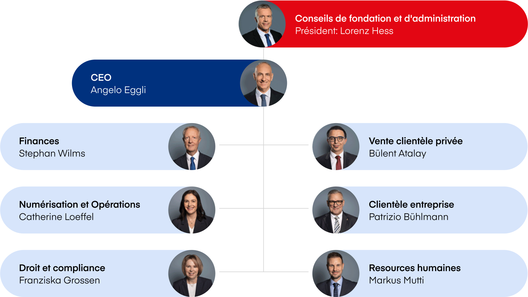 La direction générale est responsable des affaires courantes et met en œuvre les directives stratégiques du conseil d’administration. Elle coordonne les différentes sociétés et veille à ce que Visana, en tant qu’assureur toutes branches, fournisse des prestations de qualité.