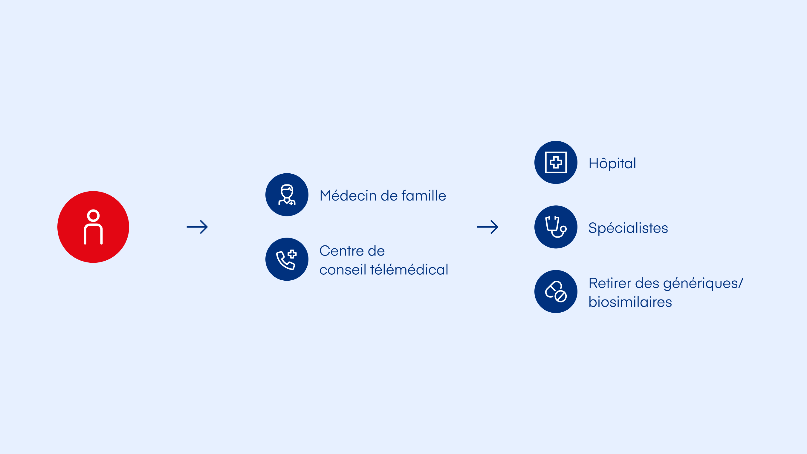 Si le/la médecin traitant/e vous oriente vers un/e spécialiste, vous devez l’annoncer à Medi24. Il en va de même lors de l’entrée dans un hôpital ou un établissement médico-social.