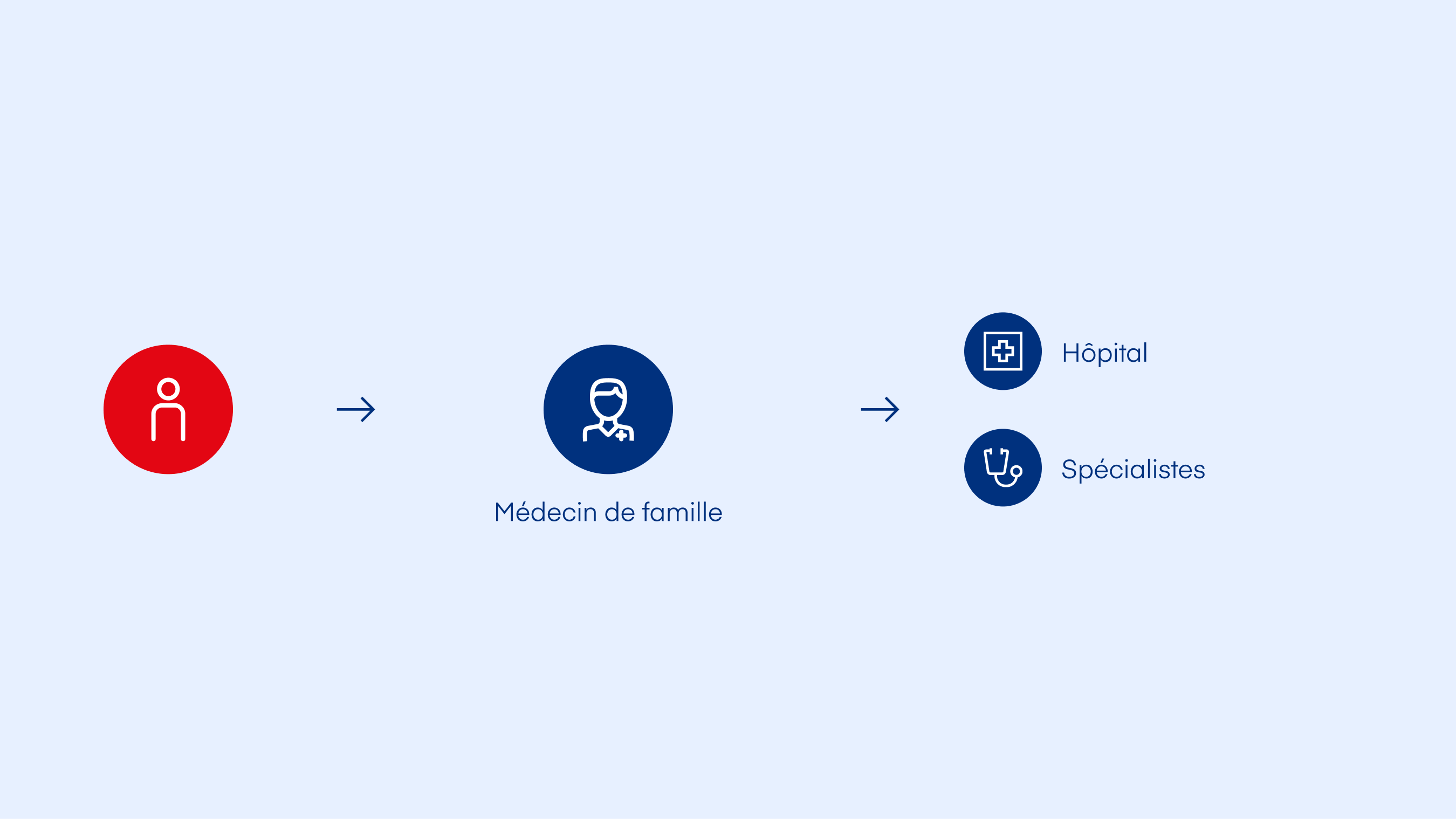 Pour toutes vos demandes médicales, vous vous adressez à votre médecin de famille. Vous ne pouvez consulter d'autres fournisseurs de prestations, en particulier des spécialistes, que si vous êtes redirigé/e par votre médecin de famille.