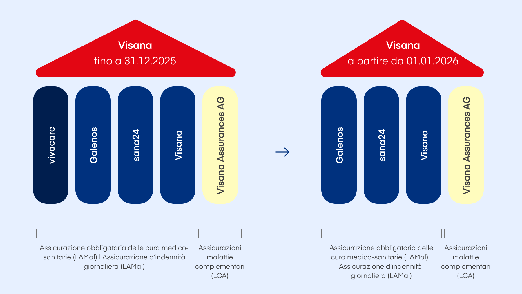 Sotto l’egida di Visana operano diverse compagnie di assicurazione. Per il 1° gennaio 2026, Visana ha compiuto un ulteriore passo verso la semplificazione, unendo vivacare SA a Galenos SA.