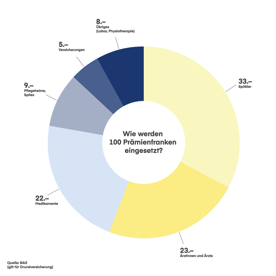 Haben Sie gewusst, dass 95 von 100 Prämienfranken der Grundversicherung für die Begleichung der Gesundheitskosten bei den Leistungserbringern wie Ärzte, Spitäler oder Therapeuten eingesetzt werden?