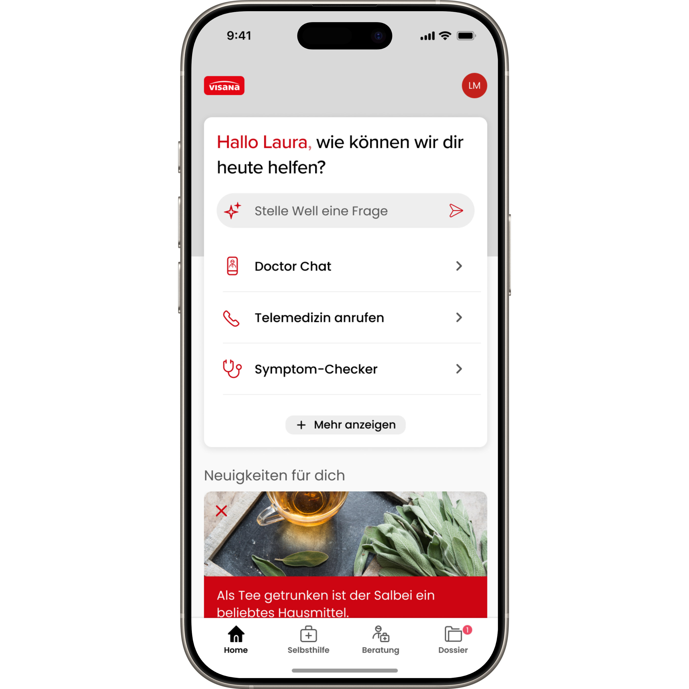 Mit der Well-App haben V⁠i⁠s⁠a⁠n⁠a-Kundinnen und -Kunden jederzeit kostenlosen Zugang zu digitalen Gesundheitsservices – einfach, schnell und auf ihre Bedürfnisse abgestimmt.